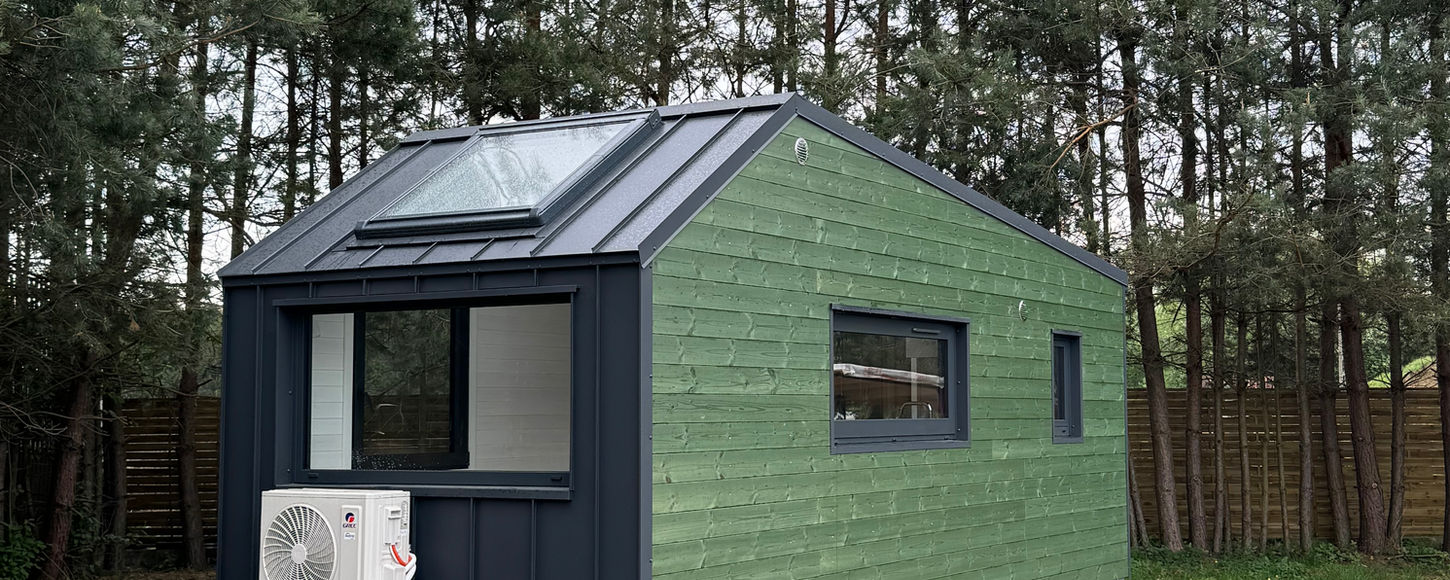 De buitenzijde van dit Tiny House is afgewerkt met thermowood gevelplanken, groen geschilderd. Maar je kan er altijd nog een eigen touch aan geven.