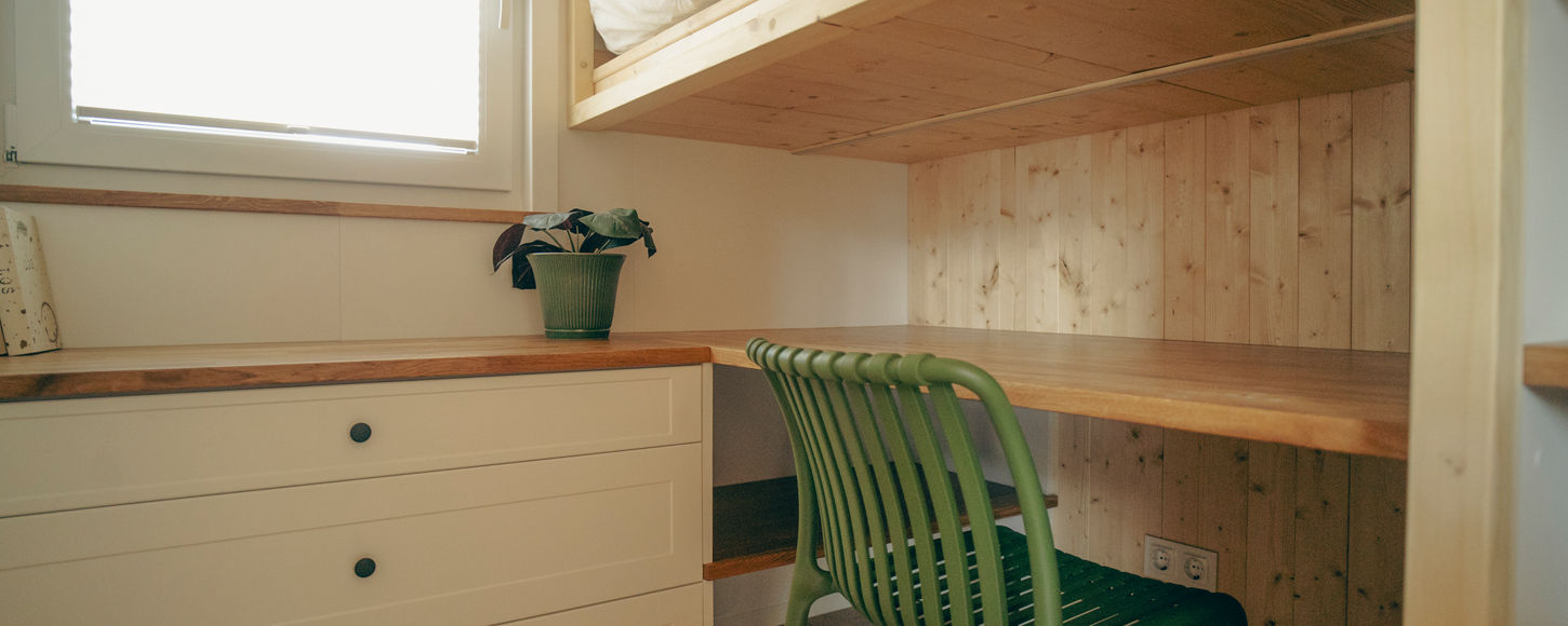 Het enige wat je moet voorzien is een waterslang, verlengkabel en een afvoerbuis naar de riolering en je kan dit Tiny House direct gebruiken.